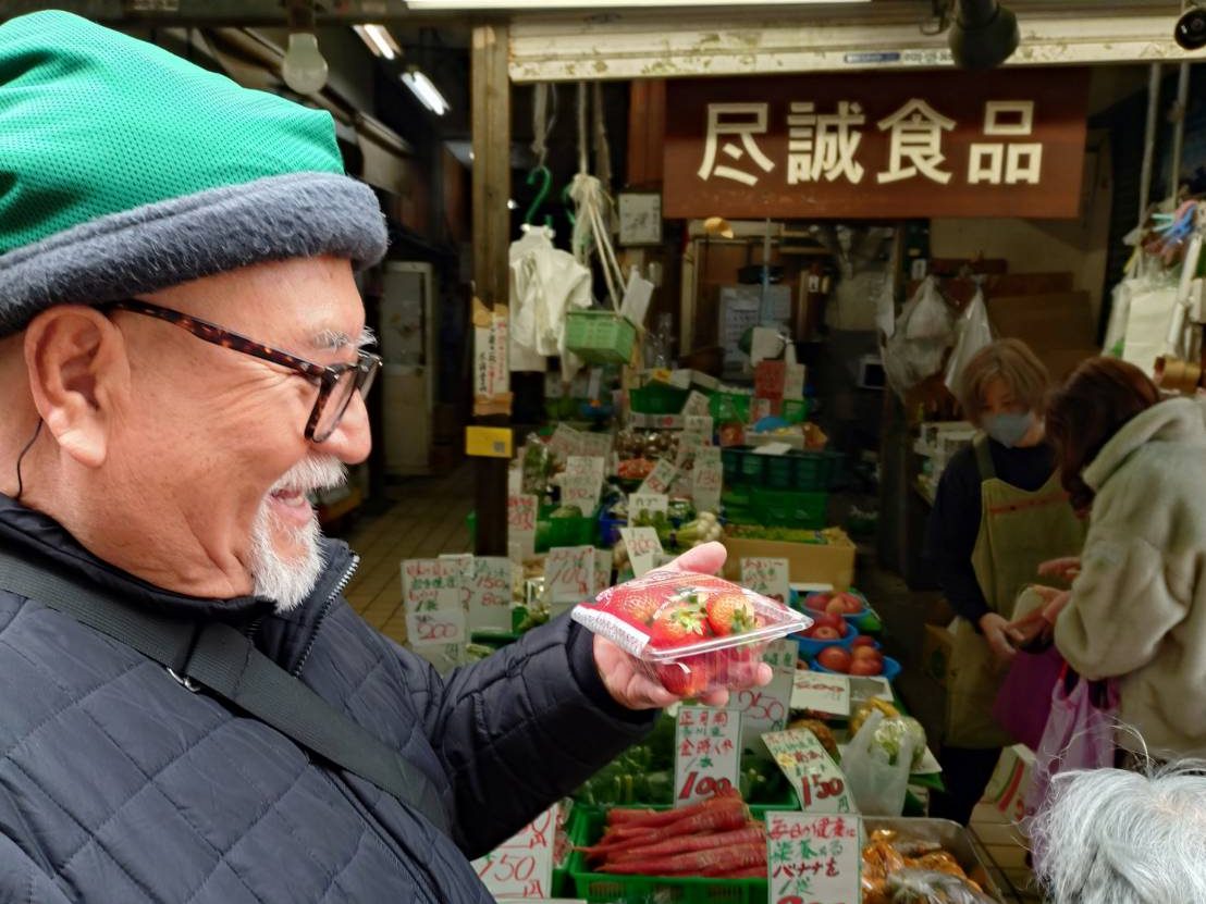 Our guest Mario-san from Argentina enjoyed strawberries at Jimsei Shokuhin, a greengrocers in Yanaka Ginza Shopping street close to Sakura Hotel Nippori.
